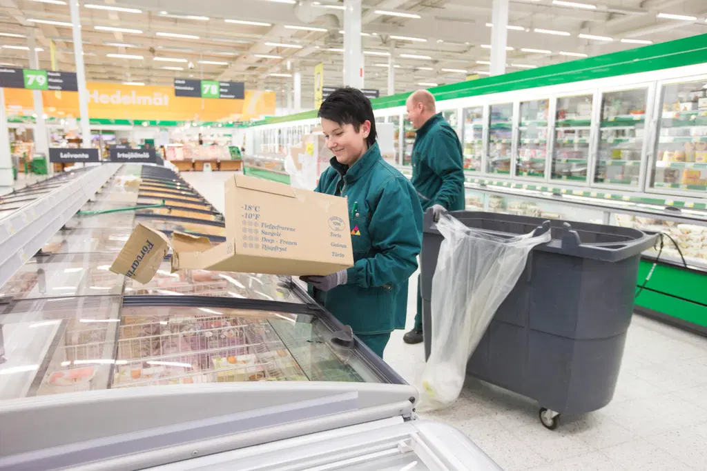 Prismassa jätemuovista valtaosa tulee päivittäistavarapuolelta. – Nykypäivänä jätteiden lajittelu ja kierrätys on kiinteä osa myyjiemme arkityötä, ja siihen kiinnitetään paljon huomiota. Vaikka volyymit ovat jatkuvasti kasvaneet, jätteiden määrä on vähentynyt, Prisman myyntipäällikkö Miia Karjalainen kuvailee. Ryhmätasolla muovia vähennetään myös kestäviä pakkausratkaisuja edistämällä. Esimerkiksi omien merkkien tuotepakkauksia uudistetaan ympäristöystävällisemmiksi ja kierrätysmuovin käyttöä pyritään lisäämään. Erilaisia vaihtoehtoja muoville tutkitaan jatkuvasti. – Tulin nykyiseen tehtävääni vuonna 2013. Tänä aikana tuotteiden pakkauksissa on tapahtunut iso muutos. Käytössä on nykyisin biopohjaisia ja kompostoituvia ratkaisuja. Tyypillisin muovin korvaamiseen soveltuva pakkausvaihtoehto on ollut kartonki, Miia toteaa.Kirkkaan pakkausmuovin keräily aloitettiin Kuopion Prismassa 2010-luvun alkupuolella. Vuonna 2014 otetussa kuvassa myyjät hyllyttävät pakasteita. Isoon harmaaseen astiaan laitetaan pahvit ja siinä kiinni olevaan isoon säkkiin kirkas muovi. Nykyisin pahviastian kyljessä roikkuu kaksi säkkiä, joista toiseen päätyvät muovipakkaukset.78 prosenttia jätti muovikassin hyllyyn