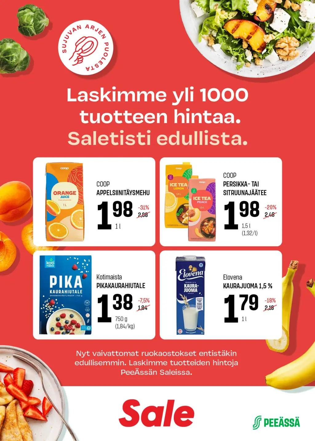 PeeÄssän Sale-myymälöissä on toteutettu laaja hinnanalennus, joka näkyy nyt asiakkaiden ostoskorissa. Yli tuhannen tuotteen hintoja on laskettu pysyvästi, ja edullisemmat hinnat kattavat monipuolisesti arjen ostoksia aina elintarvikkeista päivittäistavaroihin.Tavoitteena on helpottaa asiakkaiden arkea ja tarjota laadukkaita tuotteita entistäkin kilpailukykyisemmin hinnoin. Hinnanalennukset näkyvät PeeÄssän Sale-myymälöissä kautta maakunnan.Esimerkiksi nämä tuotteet ovat nyt pysyvästi edulliseen hintaan PeeÄssän Sale -myymälöissä: