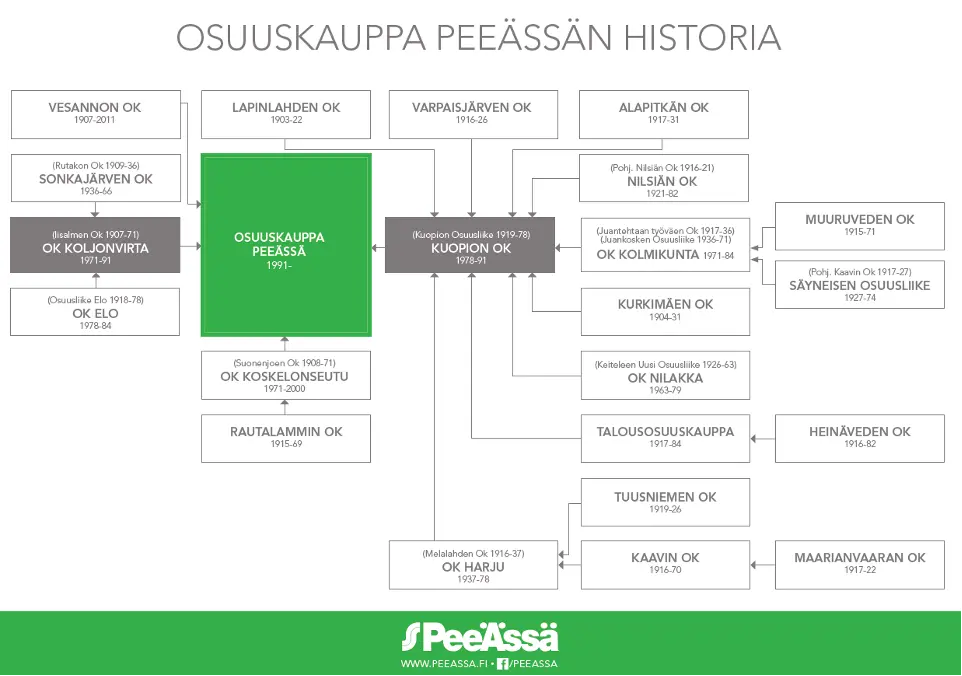 Näin tuumattiin yli 120 vuotta sitten Lapinlahdella. Osuuskauppa PeeÄssän syvimmät juuret ulottuvat noihin hetkiin. Vuoden 1902 lopulla joukko uudistusmielisiä lapinlahtelaisia halusi varmistaa pitäjän asukkaille laadukkaiden tavaroiden ja palvelujen saannin hyvään hintaan perustamalla osuuskaupan. Lapinlahdella innostuttiin vastikään Suomeen saapuneesta osuuskunta-aatteesta poikkeuksellisen aikaisin, sillä Suomen ensimmäinen osuuskauppa oli perustettu Turkuun vasta vuotta aiemmin.Iisalmessa ilmestyneessä Salmettaressa kerrottiin osuuskaupan perustamiskokouksesta 18.10.1902.– Toivottavaa olisi, että jokainen rupeaisi osuuskunnan jäseneksi. Tämä on merkkitapaus Lapinlahden historiassa. Sen seuraukset tulevat olemaan niin moninaiset ja siunausta tuottavat, että emme vielä aavistakaan, Salmettaressa ennakoitiin. Osuuskauppaa olivat puuhaamassa pitäjän tunnetut vaikuttajat, mukana talon isäntiä, maanviljelijöitä, opettajia, agronomi, asemapäällikkö, apteekkari, kunnallislautakunnan esimies, kunnan rahastonhoitaja sekä merikapteeni, jolle tiettävästi kuului ansio siitä, että uusi aate saapui Savon sydänmaille ensimmäisten joukossa. Pitäjän tunnettuna kulttuuripersoonana, maalaiskartanon isäntänä ja kirkkoväärtinä merikapteeni vaikutti vahvasti myös siihen, että osuuskauppa sai rakentaa myymälän pitäjän keskeisimmälle paikalle aivan kirkon tuntumaan. Toiminta alkoi ensimmäisen kaupan avaamisesta tammikuussa 1903 suuren innostuksen vallassa. Itsenäisenä Lapinlahden Osuuskauppa toimi kuitenkin vain loppuvuoteen 1922 asti. Osuuskaupan hallinnossa nähtiin, että toiminnan vakauttamiseksi ja kehittämisen edistämiseksi tarvittiin monipuolisemmin tuotteita, vuolaampaa tavaravirtaa, enemmän myyntiä ja lisää palveluja käyttäviä asiakkaita. Niinpä pitäjäosuuskauppa päätettiin liittää viisi vuotta aiemmin perustettuun Kuopion Osuusliikkeeseen. Lapinlahtelaisilla oli myös suuremmassa osuuskaupassa vahva omistajuus. Esimerkiksi jatkosodan aikaan vuonna 1943 Kuopion Osuusliikkeen vajaasta tuhannesta jäsenestä oli 13 prosenttia Lapinlahdelta. Sodan päättyessä osuusliike oli saavuttanut vankan kannatuksen, ja siitä oli tullut sekä kaupunkilaisten että maalaisten tarpeita vastaava osuuskunta, johon olivat liittyneet myös Varpaisjärven ja Alapitkän osuuskaupat.