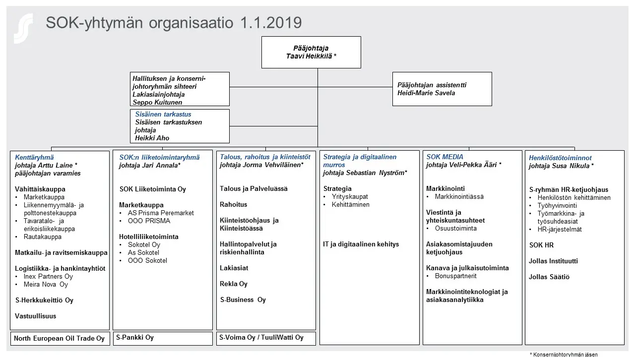 SOK-yhtymän konsernijohtoryhmän jäsenten vastuualueissa tapahtuu muutoksia 1.1.2019 alkaen. Tehtäväkierrolla vahvistetaan yli vastuualueiden ulottuvaa entistä tiiviimpää yhteistyötä, osaamisen laajentumista sekä uutta näkemystä S-ryhmän johtamiseen digitaalisen murroksen keskellä.SOK:n Liiketoimintaryhmän johtajana aloittaa SOK-yhtymän nykyinen CFO Jari Annala. Annalan vastuulle tulevat kuulumaan Sokotel Oy sekä SOK:n Viron ja Venäjän marketkauppa ja hotelliliiketoiminta. Annala jatkaa S-Pankin hallituksen puheenjohtajana.SOK-yhtymän CFO:na aloittaa nykyinen SOK:n Liiketoimintaryhmän johtaja Jorma Vehviläinen. Vehviläisen uuteen vastuualueeseen kuuluvat mm. SOK-yhtymän talous, rahoitus ja kiinteistöt.S-ryhmän digimurros eteneeSOK-yhtymän strategiajohtaja Sebastian Nyströmille siirtyy SOK-yhtymän tietohallinto. Nyström vastaa jatkossa muutosjohtajana S-ryhmän strategisesta kehittämisestä ja digitaalisesta murroksesta, koordinoiden eri yksiköiden digitaalisia hankkeita ja johtaen johtoryhmätasolla SOK-yhtymän tietohallintoa.Muiden SOK-yhtymän konsernijohtoryhmän jäsenten vastuualueet säilyvät ennallaan. Kenttäjohtaja Arttu Laine jatkaa pääjohtajan varamiehenä.Lisätietoja: SOK:n pääjohtaja Taavi Heikkilä puh. 010 768 0200Liite: SOK-yhtymän organisaatio 1.1.2019Liitteet: