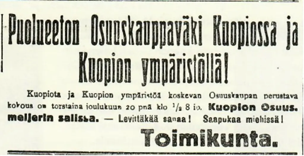 Pohjoissavolaisen osuuskauppatoiminnan aikajana 1900- Osuustoiminta on rantautunut Suomeen. Uusi aate leviää nopeasti, sillä se tarjoaa mahdollisuuden itse päättää omista asioista otettaan kiristäneen Venäjän alaisuudessa. Osuustoiminta on myös tie rehtiin ja tasapuoliseen kaupantekoon, vastapainona yksityiskauppiaiden mielivaltaiselle hinnoittelulle, vastuuttomalle velaksi myynnille sekä tuotteiden ja palvelun heikolle laadulle.